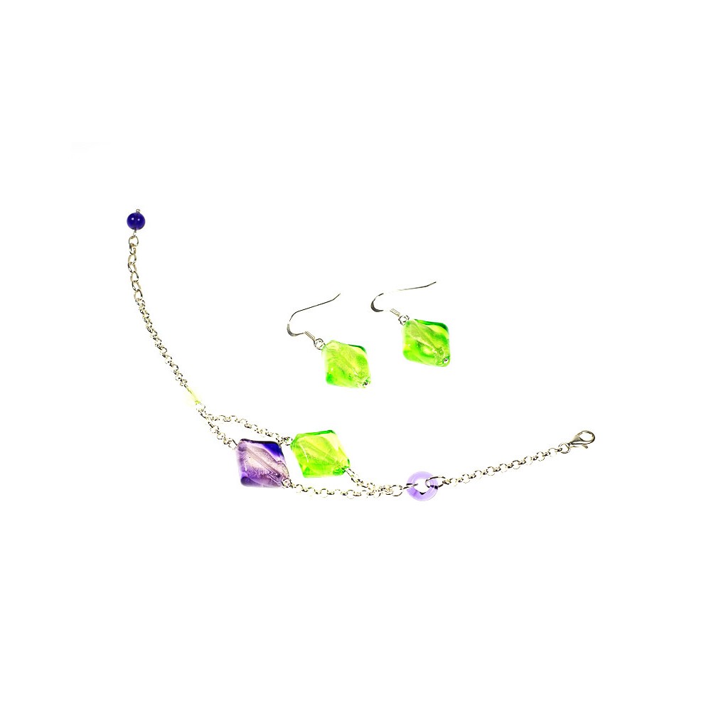 Handcrafted 2-piece Murano glass jewelry set (bracelet and earrings) with silver aplications, accompanied by Millefiori certificates of authenticity and guarantee.Recipient :