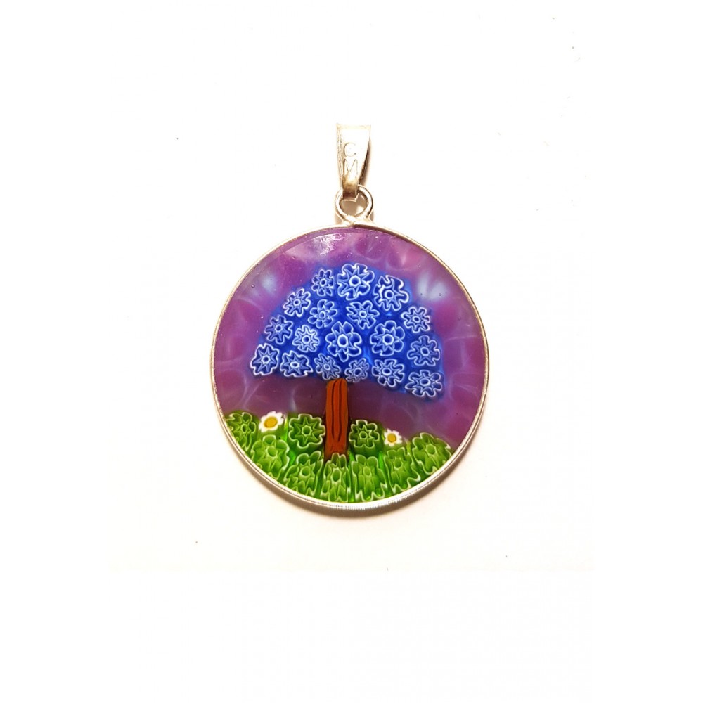Pandantiv prelucrat manual, din sticla de Murano, cu murrine delicate și montură din argint (diametru 2,3 cm), însoțit de certificat de garanție și autenticitate Millefiori.