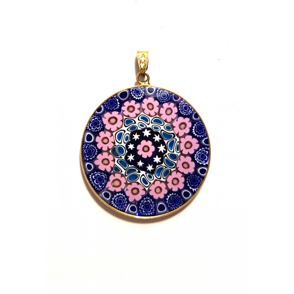 Pandantiv prelucrat manual, din sticla de Murano, cu murrine delicate și montură din argint aurit (diametru 3,2 cm), însoțit de certificat de garanție și autenticitate Millefiori.