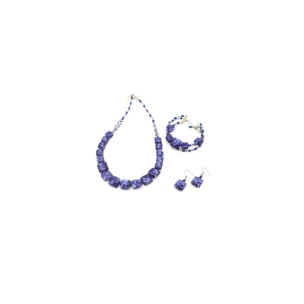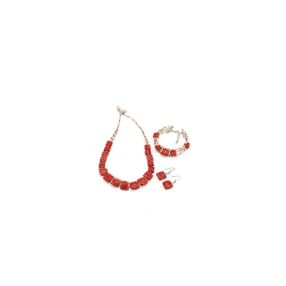 Set (colier,bratara si cercei) prelucrat manual, din sticlă de Murano, însoțit de certificat de garanție și autenticitate Millefiori. Lungimea colierului este de 50-55 cm.