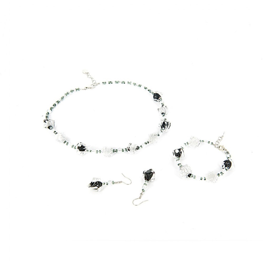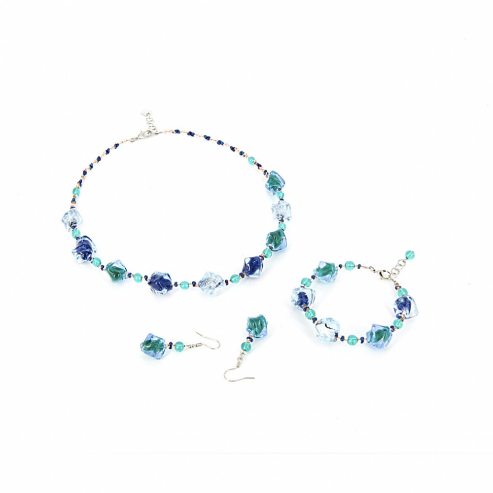 Set bijuterii cu 3 piese (colier, bratara, cercei), prelucrat manual, din sticla de Murano, insotit de certificat de garantie si autenticitate Millefiori.Destinatar(i) :